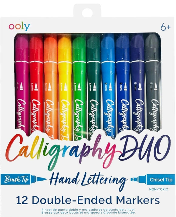 Ooly Calligraphy Duo - 12 Double Ended Calligraphy Pens for Writing & Hand Lettering, Dual Tip Pens for Beginners or Kids Includes 1 Brush & 1 Chisel Tip Pen in Classic Colors