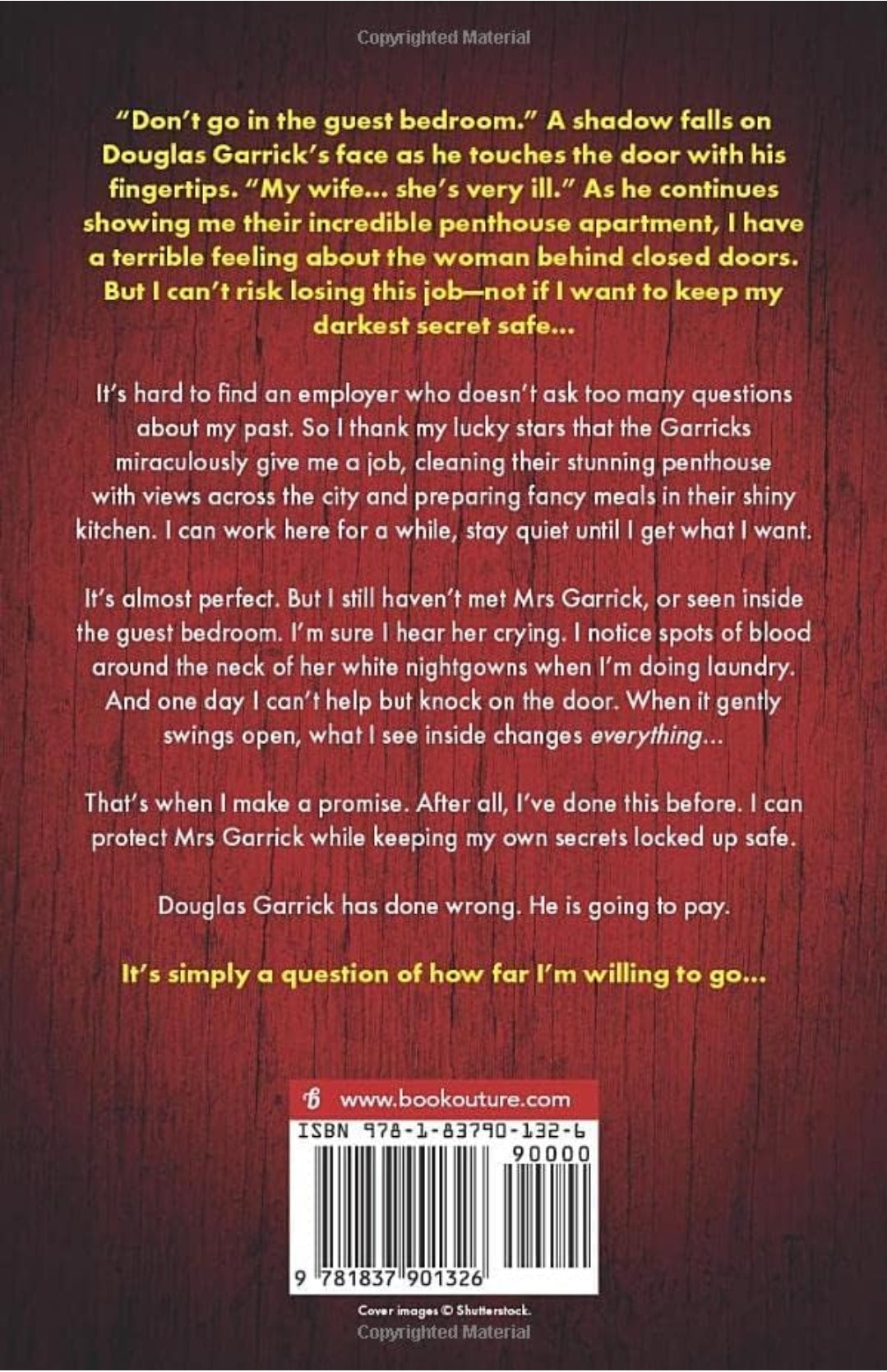 It’s almost perfect. But I still haven’t met Mrs Garrick, or seen inside the guest bedroom. I’m sure I hear her crying. I notice spots of blood around the neck of her white nightgowns when I’m doing laundry. And one day I can’t help but knock on the door. When it gently swings open, what I see inside changes everything…